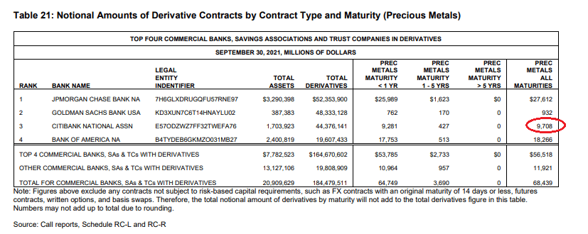 Basically, just using back of the napkin math here, you have JPMorgan at $27B and BoA at $18.2 B…but Citi at $9.7B. If you add BoA and Citi, you get about what the JPMorgan number is. So for argument sake, if JPM had 1.2B oz amassed, that could have been Citi with 400m oz and BoA with 800m. Ted doesn’t address what that Citi number is.