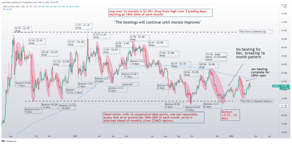 While I did that study for 16 months showing the price was murdered every month, I showed trepidation this past month with calling the bomb down. The main reason was FOMC was right after options expiration, and if you went and sold paper and Old Man Dove showed up for the minutes, you could have been blown out of the water. So I called silver in a range from $23.60-$23.80, and it finished at like $23.75. I did a video with Arcadia last month kind of unpacking how I arrived at there. In fairness, I don’t think I called that range on the video, but I had tweets out with the range. Chris was calling for $23. Right after FOMC, the price was then bludgeoned as the LBMA options had yet to expire so they were murdered for that then. So Chris was right for the LBMA options 🙂