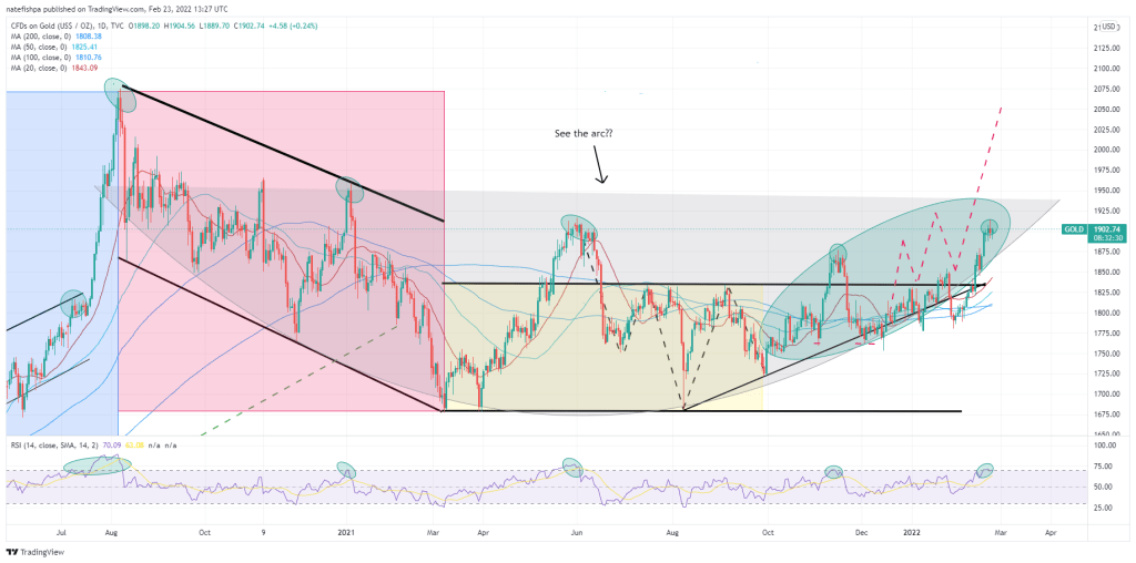 If we look at the same chart but look at the red circles, you can see 4 red circles which have the “oversold”. So on the big picture, you saw the run up to 2089, then consolidation – and the red circles indicating you just lost 30 hands in a row, time to bet big up. You can see once it hits 30, you have a nice leg up. The LAST time we hit 30 was August 2021. And, you can see in the BLUE circles, when the cruise liner turned around, you weren’t losing 30 hands in a row anymore before people started betting on you, maybe it was only 5. Meaning, when you are in an up leg like this, you will have corrections, but you won’t often get to that RSI of 30. No one wants to wait until 30, they pile in and find a bottom before that. If you see that red dotted line above, that was the line I drew several months ago projecting the directionality of this move to the arc. The shape was relatively accurate, but it lagged early and has been catching up recently.
