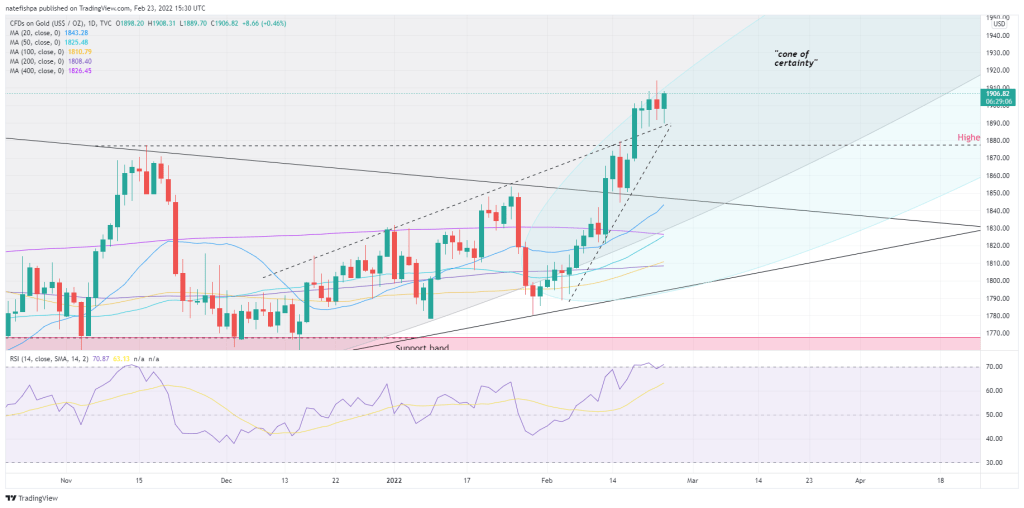 With my FSM, this is why many haven’t chased it. First, there’s risk with the San Jose mine still, although that has been mostly de-risked. It’s not that I’m smarter than hedge fund guys, it’s that – take a look at the chart – there’s too much risk. So idiots like me jump in, then wait for the big boys to get their buy signals. These can also be moving averages, especially with the 50, 100, and 200 day moving averages. If we look at gold, we can see…