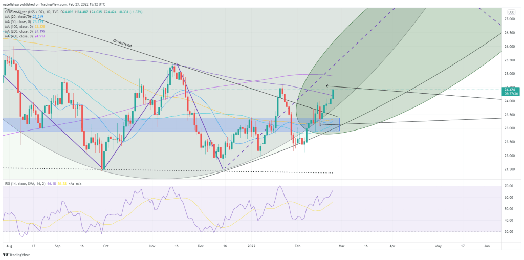 Silver? It has FINALLY peaked above the 200dma, but with options expiration in just 3 hours, we might see a close below that. RSI is NEAR 70.