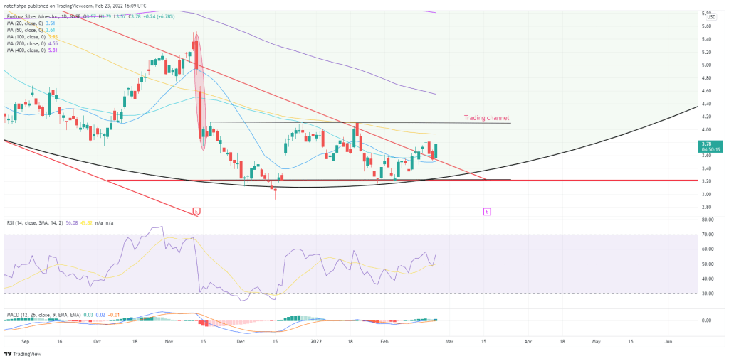 Here, it is below the 200dma, but the MACD just had a buy signal and the RSI is relatively low. I figured I might get a 10-20% move in this in a few weeks and get out for a quick trade while I’m waiting for FSM to cook.