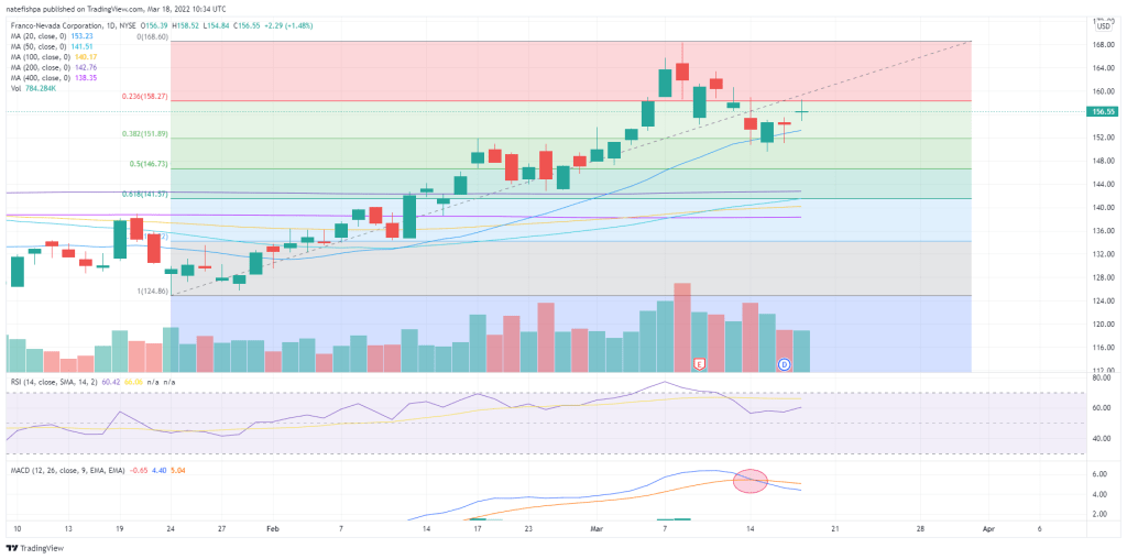 You can see FNV has had a good run, but the MACD crossover happened. I am out. Now, it doesn’t mean FNV cannot go higher on a bounce, I just know much bigger money have taken profits and are waiting for the buy signal again in a few weeks. I’m done catching falling knives.