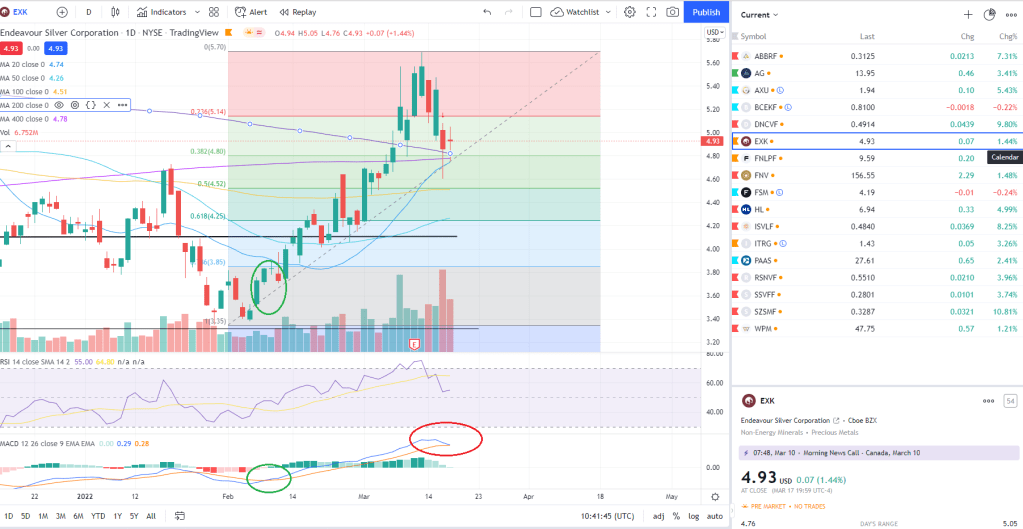 One of my favorite miners, EXK, is there now. I changed this to orange to see where it goes – check the MACD at the bottom.