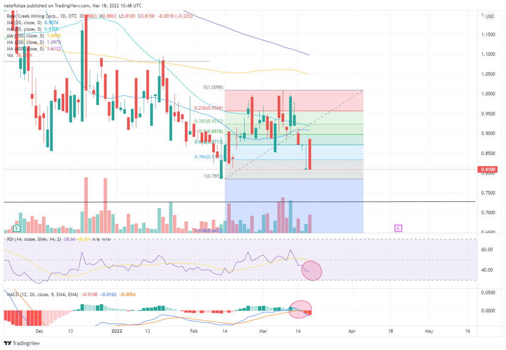 It is FAR below the 200dma. MACD SELL signal. RSI at 40. Looks like the move up to $1.00 came back down to almost a full retrace. Today, I will probably add $200 or so to my son’s trading account for his birthday. He turns 13 (I also have a 21 month old) and this account is setup for longer term holds. Bear Creek is a MASSIVE silver mine, but needs $500m in CAPEX for potential mining in 2026. I love to trade BC on 10-20% moves, but I can’t commit a full position to them for FOUR YEARS when I see summer-fall of 2023 as a great pullback. I am more likely to add a small position to my son’s account for $200 to let it potentially do a 10-20x in 4 years when they are ready to mine, and he’s ready for college.