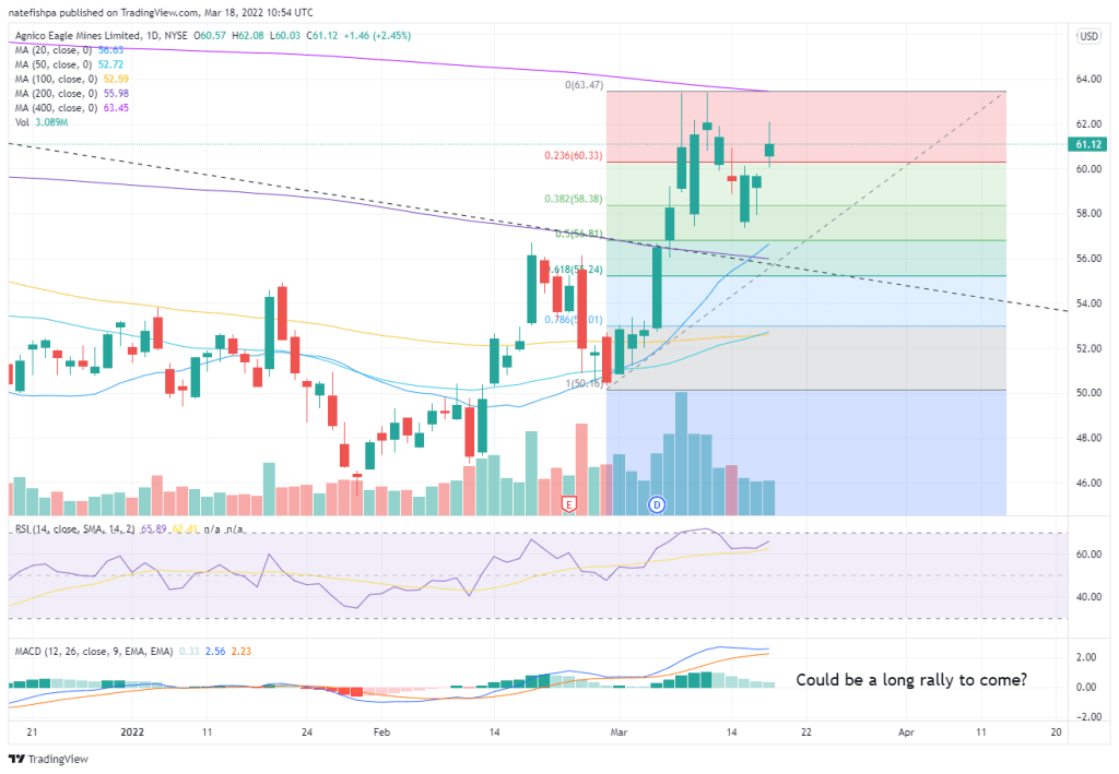 AEM is 50% under its ATH, and my BELIEF is that as money comes into gold miners, the NEM cup has runneth full and water may spill over into other majors to then have them outperform NEM. Check this…