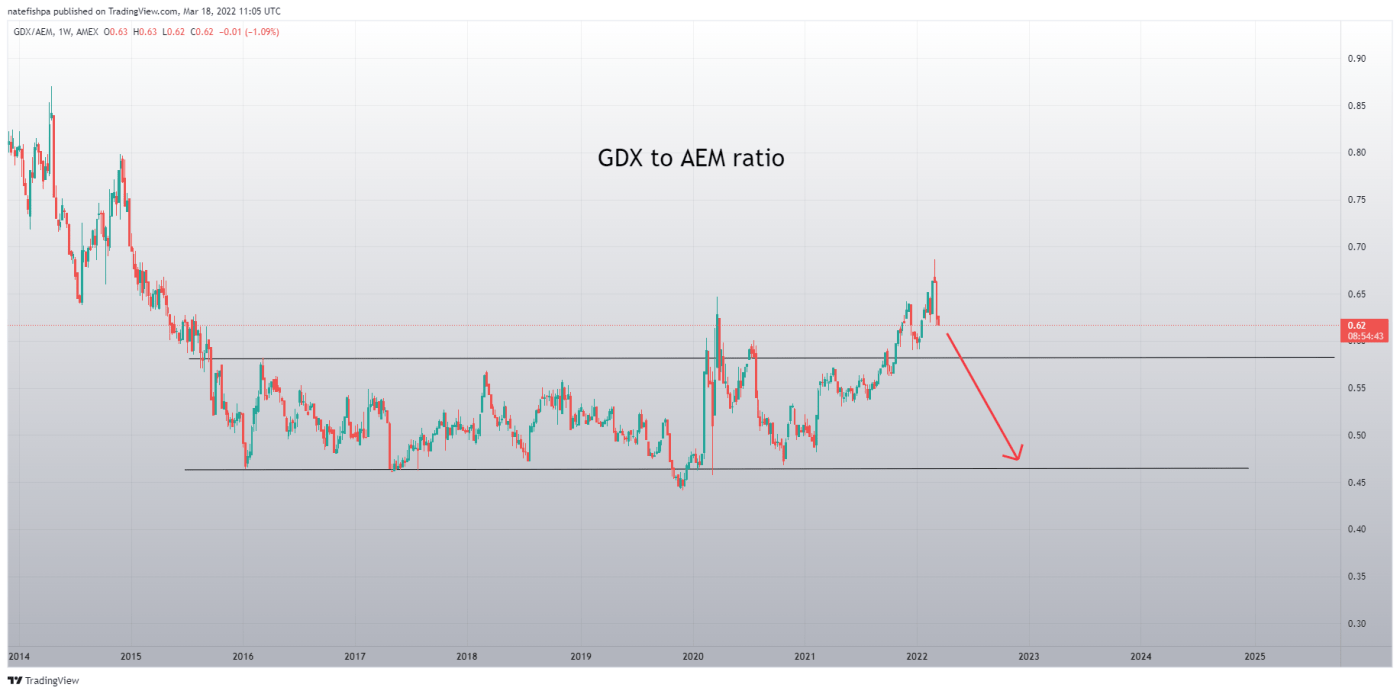 With this, you can see how the GDX to AEM ratio is going as well. To me, AEM is due to outperform its peers within GDX.