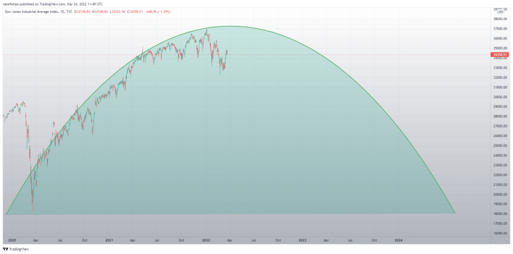 Maybe there’s a move up before it goes down, but why get cute. Might be a good time to get in gold. Below is the Dow Jones since March 2020.