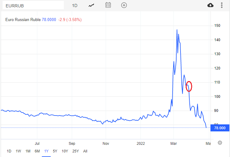 The red circle there was when I heard announcements of the 5000 RUB/g of gold. I then wrote an article about it. Since then the RUB has gone to pre-war numbers and is even stronger than pre-war.