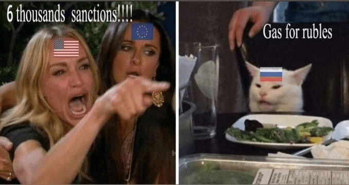 This made Western powers incensed. HOW DARE HE!! As a casual observer here, I just don’t see the big deal. If you are Poland, you would simply open an account with a Russian bank that is not being sanctioned (there are a few), then the money you would buy gas for in Euros, you give to them, and then they convert the Euros to RUB and you get the gas. There’s no price change. The problem is, you placed sanctions on Russia, and they found a way to defeat your sanctions. Had you not thought this out???