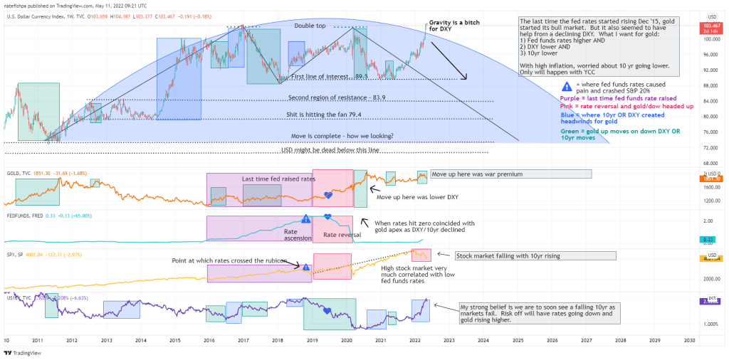 This chart I made gets no love, but what it showed was that when the Fed raised rates before, it was not that action that made gold go up. When the Fed fund rates went up, you would then see profits plunge as capital becomes more expensive. This would then lead to stock market sell offs and the 10yr going down. This was a tailwind for gold. We saw a phenomena recently where gold moved up with the DXY and the 10yr as the war was starting, but now the war premium has faded as the 10yr and DXY has gone nuts.