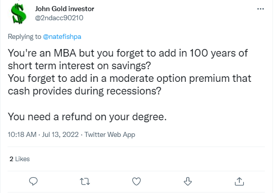 My MBA was across 3 different schools. And none of them had a single whisper about gold. I took finance like all of you. But my thought experiment was to show how the dollar falls in value relative to things. And that was missed probably by some ivy league guy who owes $300,000 in student loans right now. I guess they didn’t teach ROI at your school.