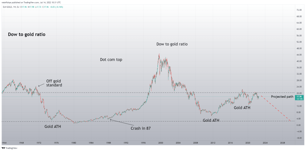 The “projected path” is starting to form. You can see that at one point in 1980, gold and dow were 1:1. I don’t see it getting back there, but at 18:1 currently, you can perhaps see a situation where not only does the dow correct down, but gold corrects up.