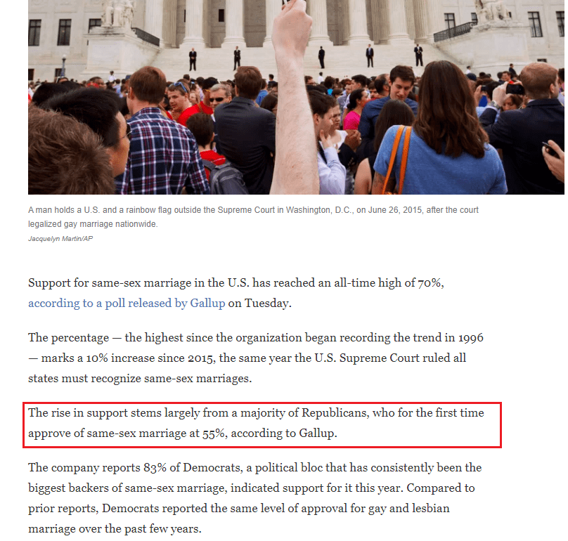 Moderates/liberals – in this arena, you have the Romneys. This guy ran in 2012 and was given the full Dem treatment of being so far right. As you can probably see, he’s probably the most left of anyone in the Senate right now. Many of these people share many of your beliefs, and want to fight for your rights, but you want to call them names and hate on them. I am pro gay marriage. Yet anyone who doesn’t know me and talk with me for 5 minutes wants to BELIEVE I am filled with hate. It’s not true. It’s how you have been conditioned for years. In fact, NPR reported that 55% of Republicans back same sex marriage. You have to stop, think, assess, and realize over half of your sworn enemy is actually fighting FOR you.