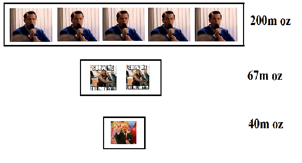 This is important to understand, as it indicates that a whole lot of paper contracts are being sold under the impression that there’s a lot more silver there that’s for sale than there is. If we assume that mine supply of silver is roughly 800m oz each year (you get another 200m via recycling, etc) you can then determine that mine supply each month, if coming in equally, is about 67m oz per month.
