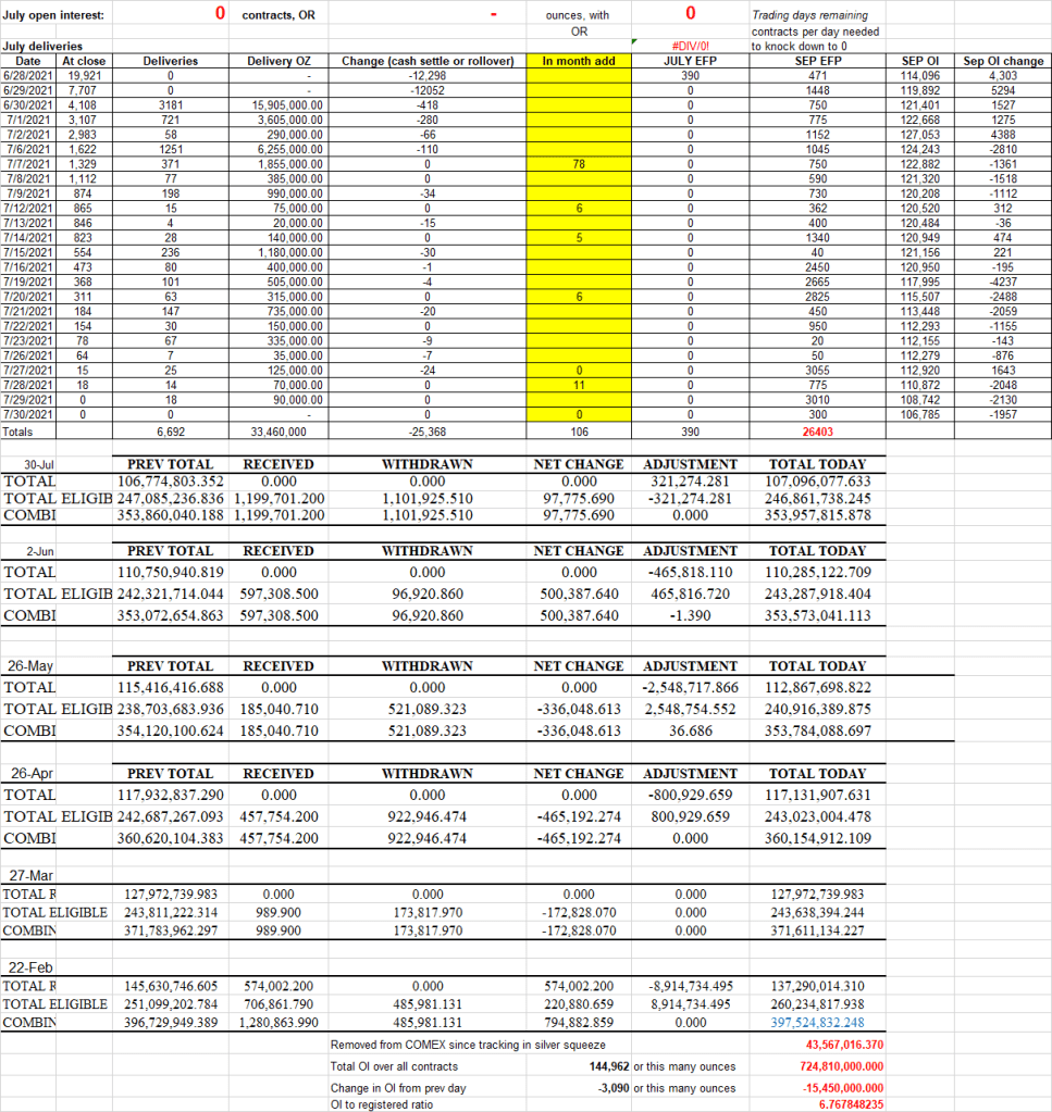 My problem here is this. IF this was all hedging, I would have no real issues because the silver would be coming into the COMEX to service those contracts. Think about it. If the TOTAL mine supply each year is 800m oz, and ALL silver comes in through here (it doesn’t), you are looking at about 66m oz per month getting added. If the total in inventory was 35m and 66m was sold, but 66m coming in, the registered of 35m is not an issue. This would perhaps be a 2:1 ratio which would not stress the market too much.