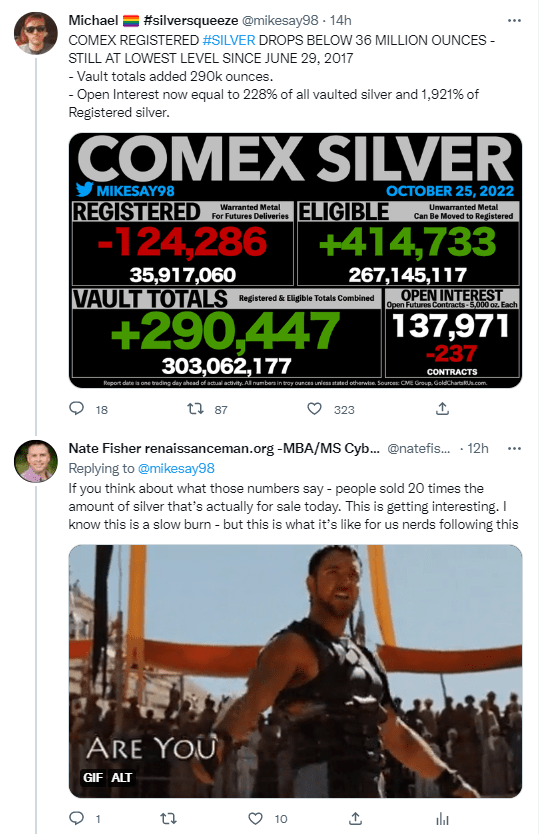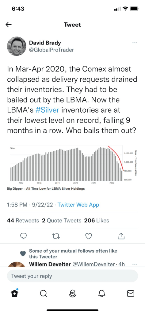 The idea here is that a lot of people “rollover” each month. But Kyle Bass destroyed the narrative with the carrying costs – if you know you would be holding the metal for a few years AND the market was getting extremely tight, that 1% that takes delivery monthly could be 5%? And, IF there’s a draw down of significance in the LBMA AND the COMEX, how is this supply being backfilled? You think dropping the price of silver by 50% over the last year entices more production? If so, you need to go back to econ 101. In fact, all of these miners are squeezed to bankruptcy – between rising fuel prices and inflation – not only did you cut the price of the product they are producing, but you then put their nuts in a vice and cranked it up because it’s causing production to slow.