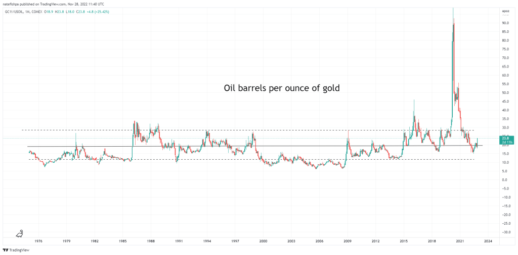 Consider that gold is $1760 and oil is $74. We look at price information through the lens of the USD. However, if we used the RELATIONSHIP between them to show their VALUE, you would see that today, you could get 23.78 barrels for an ounce of gold. you can see outliers cause less or more oil production.