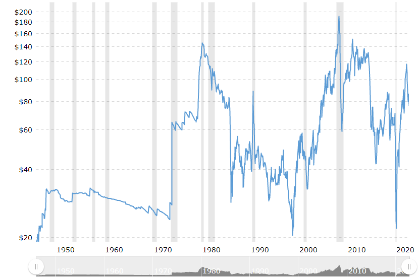 The piece of paper was a certificate you could REDEEM for gold. So, when oil was priced in dollars 100 years ago, it was essentially priced in gold. The data you see above as the price – reflects the lost value in USD over the period of the last 70 years. AND the USD has lost value against GOLD during that time too. So the BEST price information is to look at the VALUE of oil, in gold, which removes the spastic nature of the USD. The VALUE of gold or oil is not changing – the price of the USD is acting nuts.