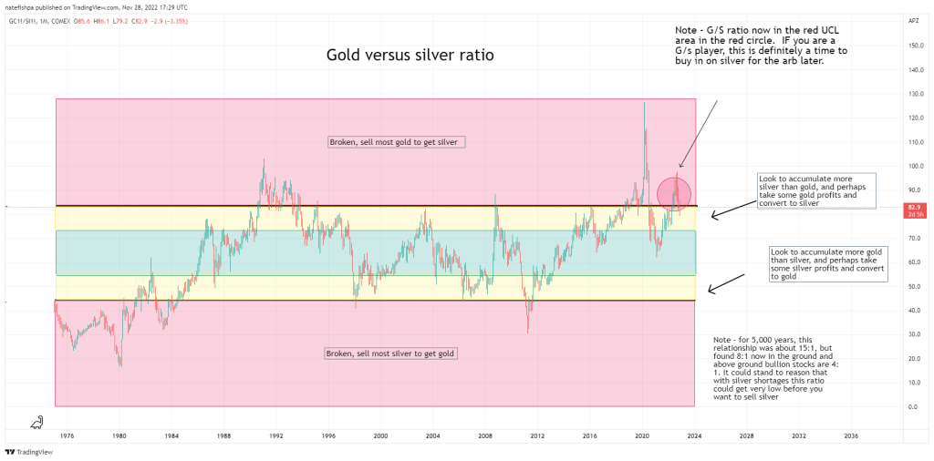 The idea is then that people start to see the relativism in the relationships to gold and start thinking of silver as 2.5 oz per gram of gold or something like that. If you see it at 3 oz per gram, you start to convert gold to silver. If it’s at 2 oz per gram, you move silver to gold, etc. As people begin moving away from a dollar nominal number to a VALUE, this is where the trade gets interesting – and relatively tightly correlated as any arbs will thus have the relationships move back to the means.