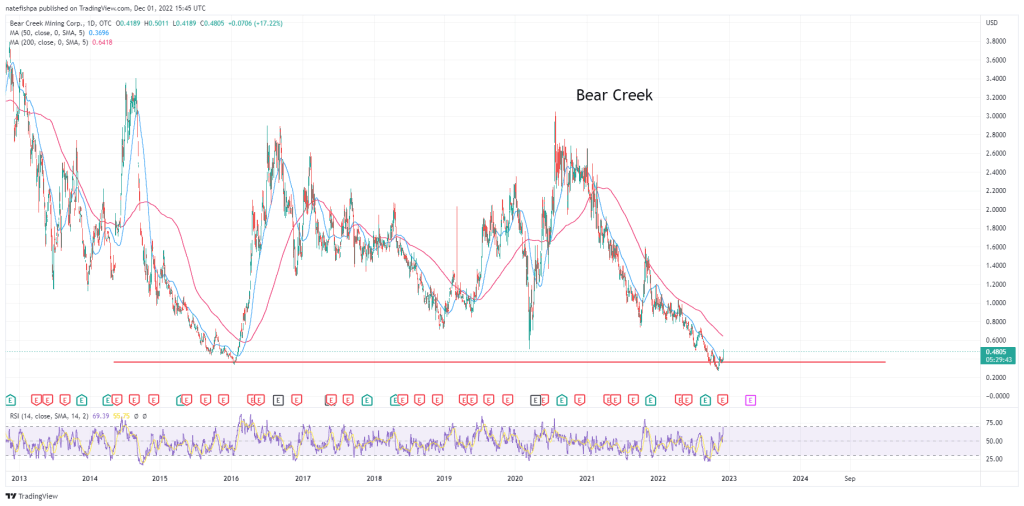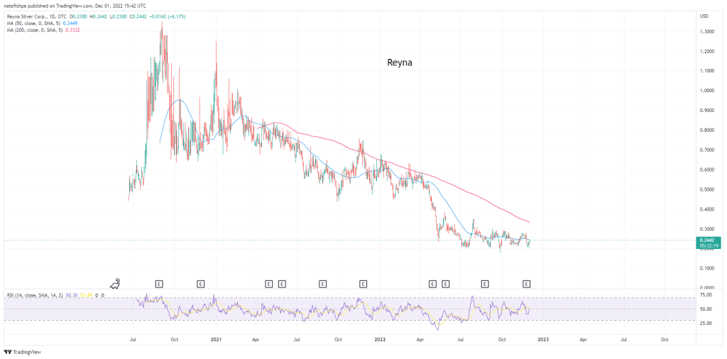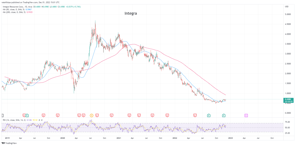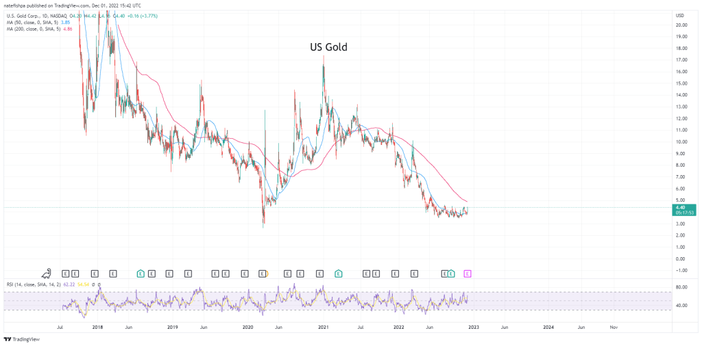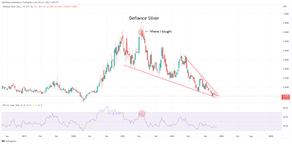 Defiance is a few of the GV portfolio I liked and bought. The issue wasn’t the stock, it was WHERE I bought. I bought this on 5/14/2021. So in the 19 months which has passed, I have learned a TON. Granted, this is a spec position, so I’m not really worried too much about it, but look at the RSI I bought at. Look at where on the move I bought it. This is a lesson of what NOT to do, and you can clearly see I had FOMO with this. And since I wrote this at 5AM, I went out and added to this position when I took a closer look at my juniors (below).