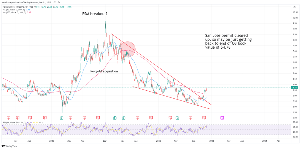 Meaning – you can easily see how just going on a 2x book value analog, that FSM could be valued, today, at about $9.50. At 3.5x? You are looking at perhaps $14 a share. What I can SEE with the FSM chart was how it was beaten down HARD with the San Jose permit situation a year ago, BEFORE the entire sector took a shit, which pushed it down further. ADDITIONALLY, the chart shows you the pretty pink area where they did the Roxgold acquisition for shares, which the investors hated (at the time). It has turned out to be a masterful move by Jorge Ganoza.