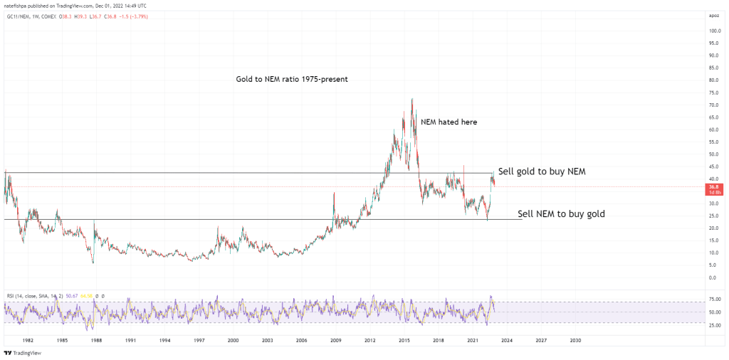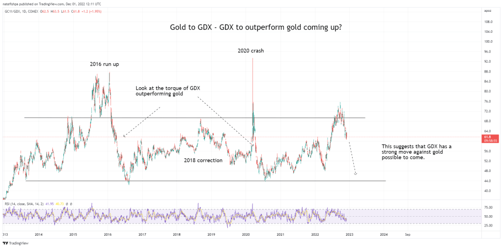If you look at that big peak in the middle, that was the March 2020 lows. You can see how GDXJ was beaten up miserably recently, and how much it can run if you look at 2016 and 2020 as analogs here. This suggests GDXJ can get to a ratio of about 30. IF this means gold is $2100, it means this could get to $70. Given it is $35 now, that’s a 2x move it has in front of it for gold to only move about 25% yet.