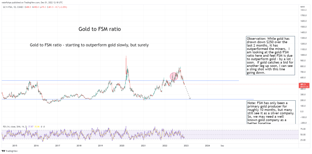 This has the ratio moving to perhaps 218. that has it at $9.63 and perhaps a 3x from here at $2100 gold. But what happens if this is $3000 gold? What the chart is also showing is a gold to FSM ratio when FSM was MOSTLY a silver miner. My best guess is this chart heads down to maybe a 100 ratio, giving FSM a $30 share price at $3000 gold. This is also conjecture and many may take issues with this high target. I can see at $3000 there is definitely a wide berth here of a $20-$30 price which is not crazy.
