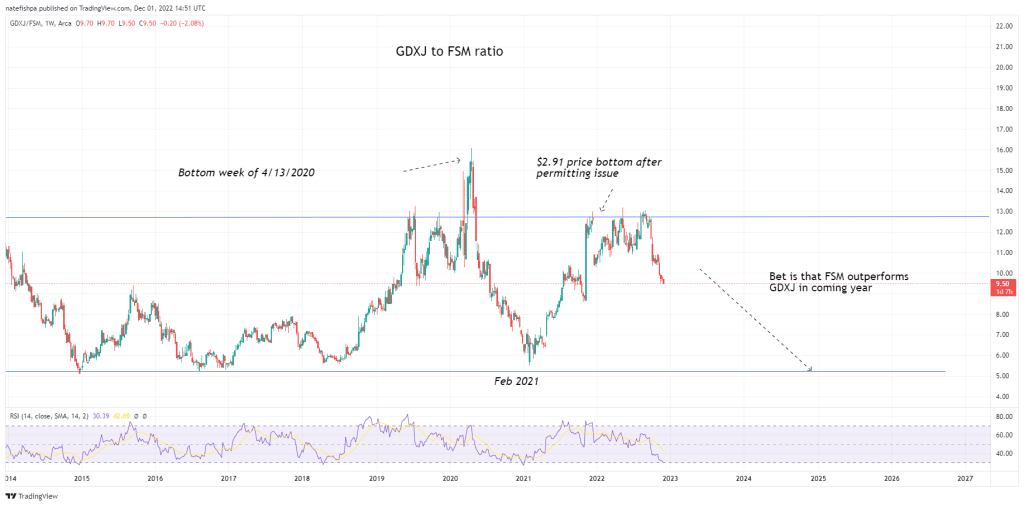 What you can also do is take a look at individual companies against the indexes. For example, I talked about FSM above – look at GDXJ to FSM.