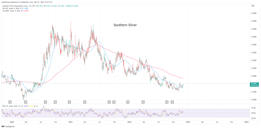 What you can see with this is this stock is WAY below both its 200dma and near its 50dma. IF there’s a nice run in silver coming, this could make a move towards at least its 50 dma, assuming this stock is still worth it. Once it crosses above the 50 dma, it might make a run to the 200dma. But that death cross down….