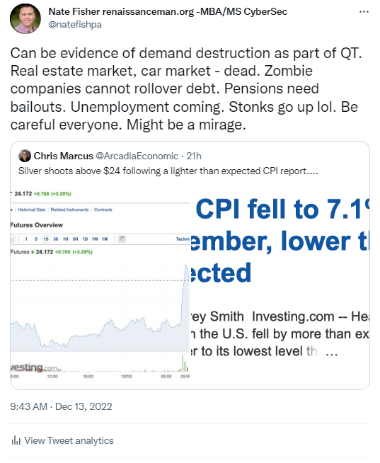 Yesterday, as markets opened 750 points higher, I was driving to work like….”this makes no sense”. To me, with the CPI going down, it was signaling they were beating inflation down, but HOW? They literally destroyed demand for everything. How do you think that’s going to show up in 4th qtr earnings?