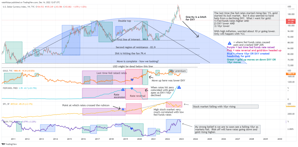 If you can see this closely, when they did the Fed Funds reversal in 2019, gold soared. DXY went down. 10yr went down. Stocks sideways and then down.