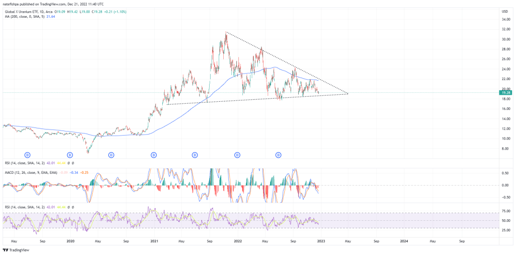I drew that triangle perhaps 8 months ago and just now pulled that chart up. Damn. In the absence of macro events, THIS is where TA can shine. URA us well under the 200dma and if we have a market crash of sorts the next 1-2 months, I could see this having a capitulation sell off. I’m putting a pin in this one to watch. To me, this is the barometer of how the market is going, although I’d probably like to play URNM instead.