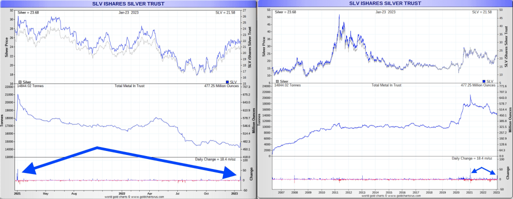 I used to do a lot of reports like this 2 years ago, but Mike’s are nicer looking and provide a lot better info at a glance. This is what mine looked like 2 years ago. He has taken on this task admirably!! You could see my tracker with the daily delivery oz – and maybe 1 day here or there nothing moved. Eight days????? since that, there was one day above with the 10k ounces out, then the next day nothing either. Odd.