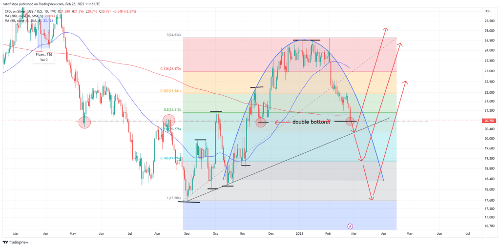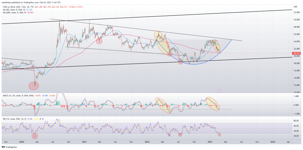 You can see zooming out with a longer time frame that silver is in an arc that should be moving up yet, and this potentially is back testing against a wall for another move up soon. If you look at the 200dma, the last time it fell below the 200dma when the 50dma was well above it, it looked like a false breakdown, and then came right back up in a V formation. Additionally, you can see the daily RSI in the red circles at the bottom is at like historic lows. The last time it was this low was July 2022, before that May 2022, and before that March 2020. Unfortunately, the RSI isn’t THAT reliable when it comes to moves, but you can see that with the March 2020 low, it was a massive slingshot up. May 2022, you had a bounce, the a further move down. July, a nice bounce before a further move down. So even if my BEAR case is $17, one has to realize we might have a bounce here to $22 or $23 before a move further down. The three red candles to close the week also might suggest a bounce is coming for at the very least a day or two to get more spec longs in before rinsing them out.