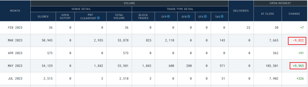 I was one of the red squares at the top. My trading account doesn’t allow for settling in silver for physical, so they closed me out automatically on Friday. It was my fault that I picked the March rather than the May contract on my most recent long. C’est la vie. It helped me understand these numbers better – as I can imagine THIS number is your people like me just playing the paper games. These all seems to then rollover into May 2023. I didn’t join them, yet.
