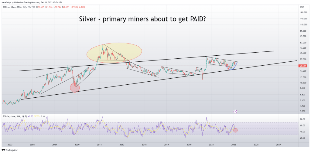 Why I believe we see upward rails on a lot of things over the 20-30-40 year time frames is due to monetary inflation in the system. These rails are accounting for “standard” inflation. At certain times like 2011 (yellow oval), you can see how inflation expectations shot silver far above this rail, but collapsed down at the talk of QT and how “inflation was trapped in the system”. However, as we all know, inflation recently has probably been over 12-15% for most items we see day to day, and inflation is killing miner margins. This is the environment to see it spike far above the channel. On this chart, it’s showing the lower rail at $17 something, and we are at a 45 weekly RSI.
