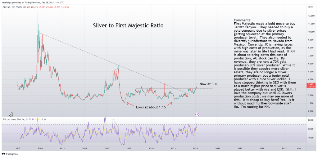 So – while I disagree at TIMES with his analysis, he IS taking this from a big-boy seat of de-risking and seeking other things to invest in, in the sector. I do not think I have ever seen him say, “yeah, it’s a buy here”. First Majestic has always had a KN premium, but is this now in risk? I’d like to dive in here and talk about them here. This is not financial advice. It’s analysis on a mining stock company that I have held in the past, and am thinking about again. Do your own research. Speak with an investment professional.
