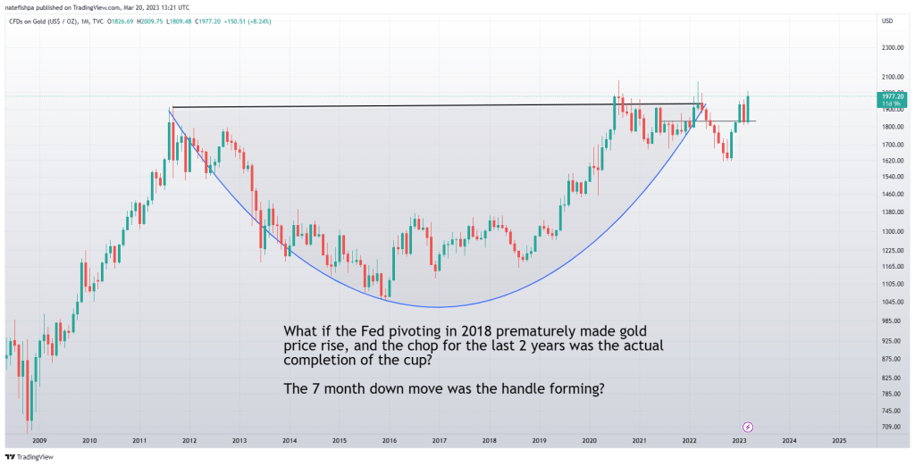 IF we look at the gold price (in log) and pontificate that the 2018 Fed pivot was NOT expected with gold price, but this unexpectedly pushed gold price up, you can then further guess that the last two years of consolidation completed the arc. This THEN led to 7 straight monthly losses for gold to form the handle.
