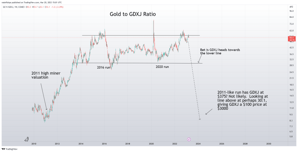 This could put the gold to Newmont ratio perhaps around 15:1. At $3,000 gold, that’s a $200 Newmont price, which is about $48 today. That’s a 5x move for a major!