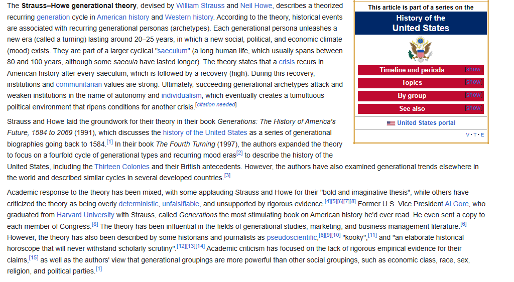 This summer, I want to read everything I can about the 4th turning. I have read the thesis, and with a 96 year old grandmother for reference, can tell you I believe a lot of this theory. Much like a bratty teen that doesn’t listen to anyone, the generational theory more or less feels that there’s some bad things coming because today’s generation doesn’t have the lessons of old to reference.