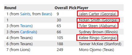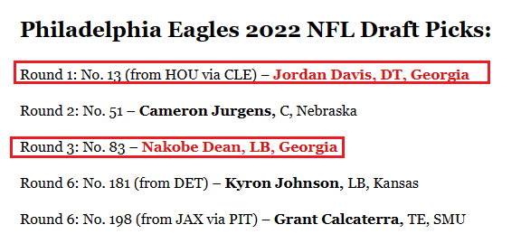 - Comradery. I see 4-5 starters from those dominant GA teams about to be starters for the Eagles, out of 11 starters. These people played with each other, know each other well, and perhaps were roommates in college. It is very possible you avoid the “dream team” scenario where you have great individual parts, but lesser teams. Drafting these studs from the best teams can perhaps build a CORE defense (GA) and a CORE offense (Alabama) where these people may want to win together for a decade.