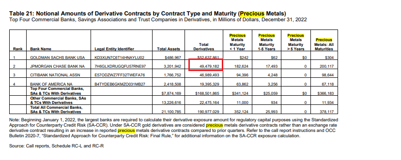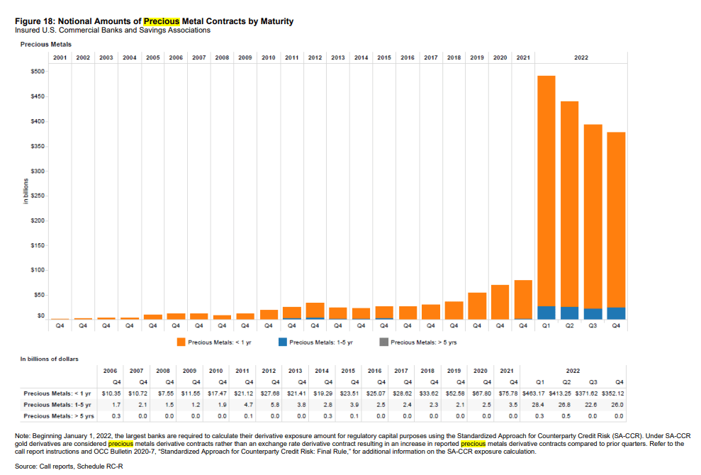 This chart is also on the OCC report, and it talks about ALL PM notional amounts of PM contracts by maturity – it has the PMs going from $463B to $350B by end of 2022, give or take. Are these leases? Could this be the COMEX hedged short positions? They don’t break this down here by metal and by company. But $500B is a much different number than $49T that JPM has with PMs. That $49T number. WTF is it?