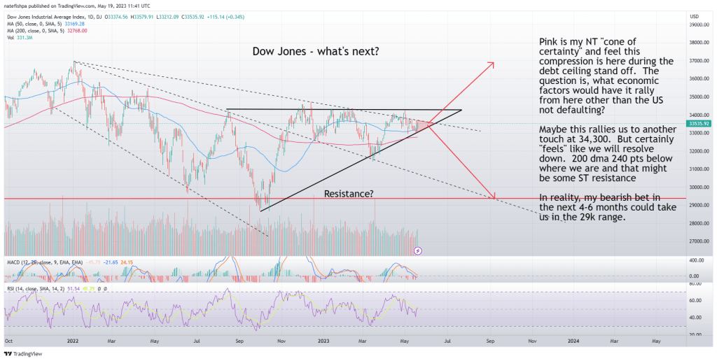 The biggest thing you see near term is that it looks like there’s a triangle setting up, which can have this thing blow shorts out of the water. Many would point to the debt ceiling as a catalyst for this, but this problem has been resolved what – 65 times before in the same manner this will be? I think the bigger catalyst is the continued rate hikes. Markets absorb the 25 point basis hikes, then after that, rally because this time it’s the last. Even if so – I believe rates will stay there for quite some time – UNLESS SOMETHING BREAKS.