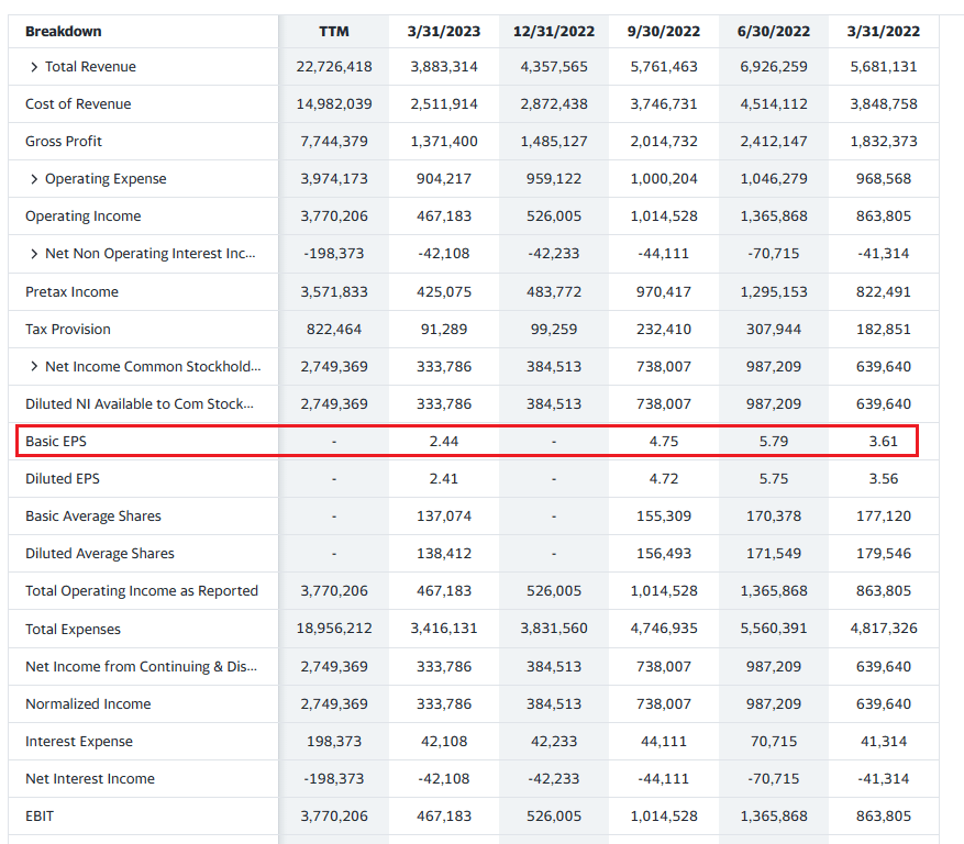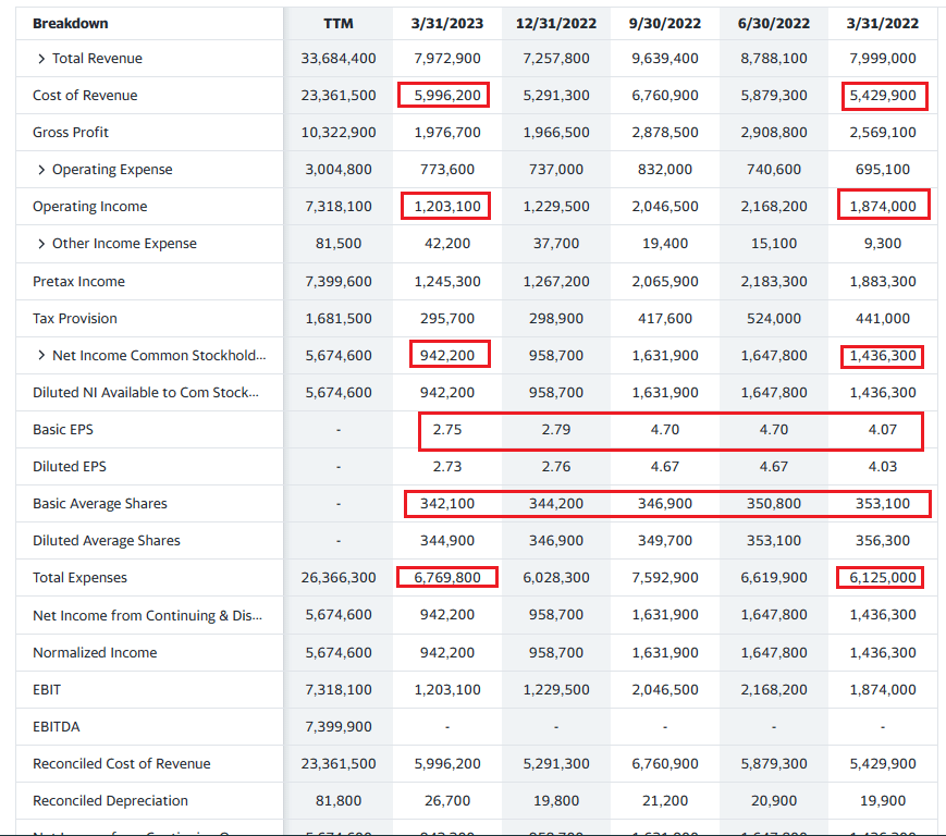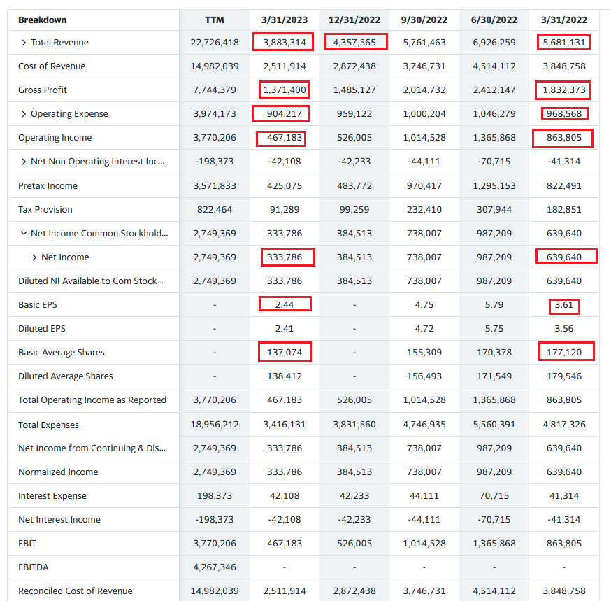 You can see that in just about every aspect, the Q1 2022 to Q1 2023 is down, by a LOT. You can also see 40m less shares, which indicates that the company bought back a lot of shares to prop the price up.