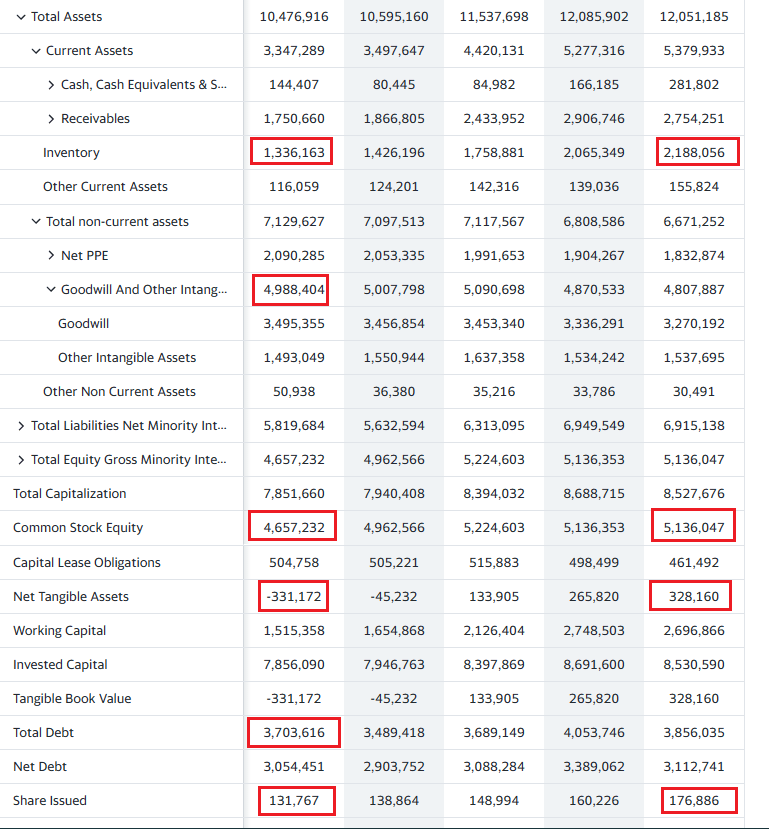 So assume you were Pepsi and had a great brand name. You maybe had $1b in inventory, but you can bank on the sales and price to produce profits in the future. IF you were to sell this company, part of its value may be in this category – depending on how you valued it. My main issue here is that if you take out the goodwill, and just wanted to sell the company for spare parts, it’s value is -$331m. A year earlier, it was $328m. That’s a hell of a swing.