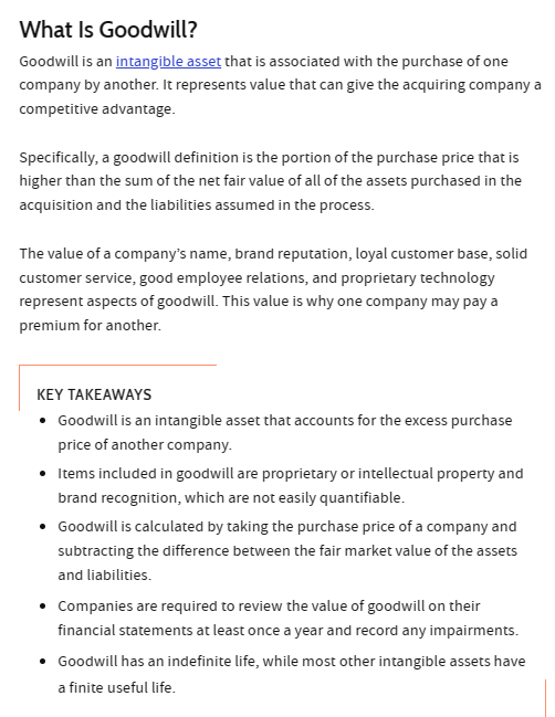 Their inventory is down 35% or so YoY. It’s good that they don’t have inventory piling up, but this also means they have less properties to sell. The common stock equity is listed at about $4.6b, down from $5.1b a year earlier. That’s 10% less equity. But a good portion of this value comes from “goodwill”. $5b. What is goodwill? I’m not a CPA either. But let’s see what investopedia says.