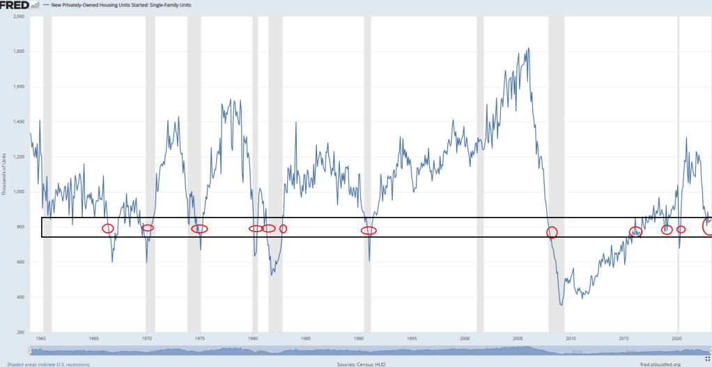 I have a red circle of where we are, today, and then walked back through the last 60 years to see where this was in relation to it. We can see that most of these red circles on the down swing were entering a recession (the gray area). You can see that most of these had a good move down to 600k from 800k. In 2008, however, this went down to below 400k. It’s not to say we won’t get there again, but it is rational, using these data points, to expect two things in the next year: