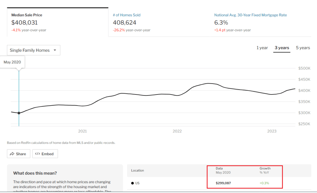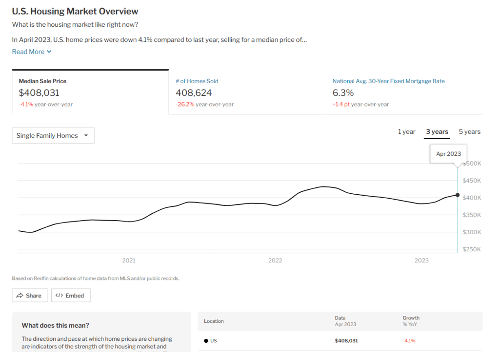 Redfin shows the avg sale price of a house is $408k, which is down only 4.1% in the last year. However, look at the top and you can see the number of homes sold in the last year is down 26.2%. With an avg mortgage rate of 6.3%. If you slide back just 3 years, the avg home price was about $300,000.