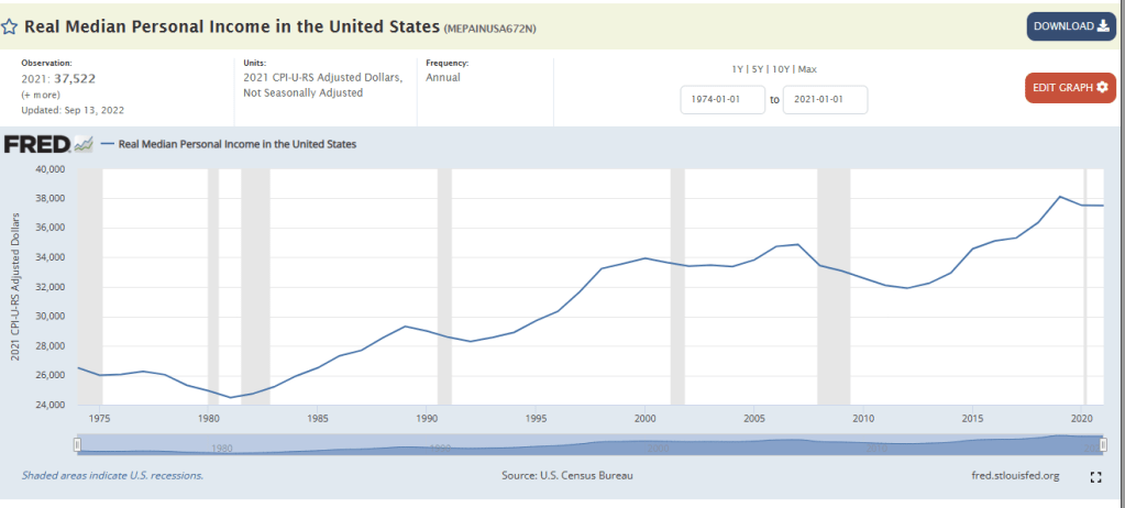 This shows the median income in 2021 as $37,000. In 2005, it’s $33,800. So in those 16 years, income grew about $3200, or about 10%.